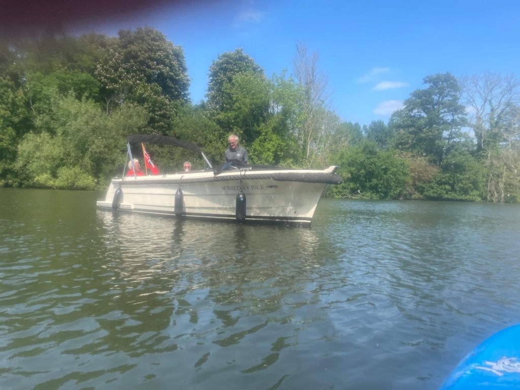 It was a lovely day to tackle this nice stretch of water with lots of greenery and not many properties, although those seen were quite upmarket! We saw a few other small non-motorised craft, sadly many with owners and no buoyancy aids, as well as the occasional motor cruiser. There were a number of Duke of Edinburgh teenagers canoeing the same stretch for their challenge and Dave was able to impart canoeing knowledge to some which was much appreciated.