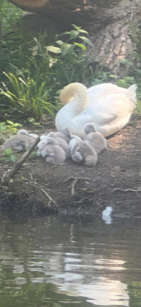 We saw three Kingfishers darting along the banks with their flash of iridescent blue. There were lots of Geese and Ducks along the way. Some had been busy, as we saw Geese with nurseries of 9 and 19 Goslings, followed by Swans with 7/8 very young Signets.
